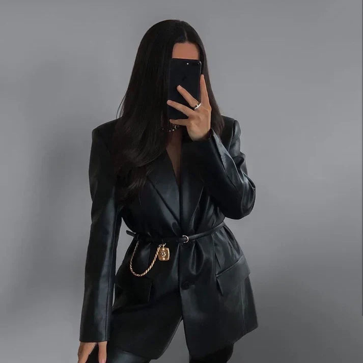 Damska marynarka z odkrytymi plecami i ozdobnym paskiem