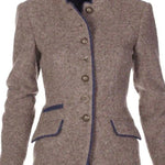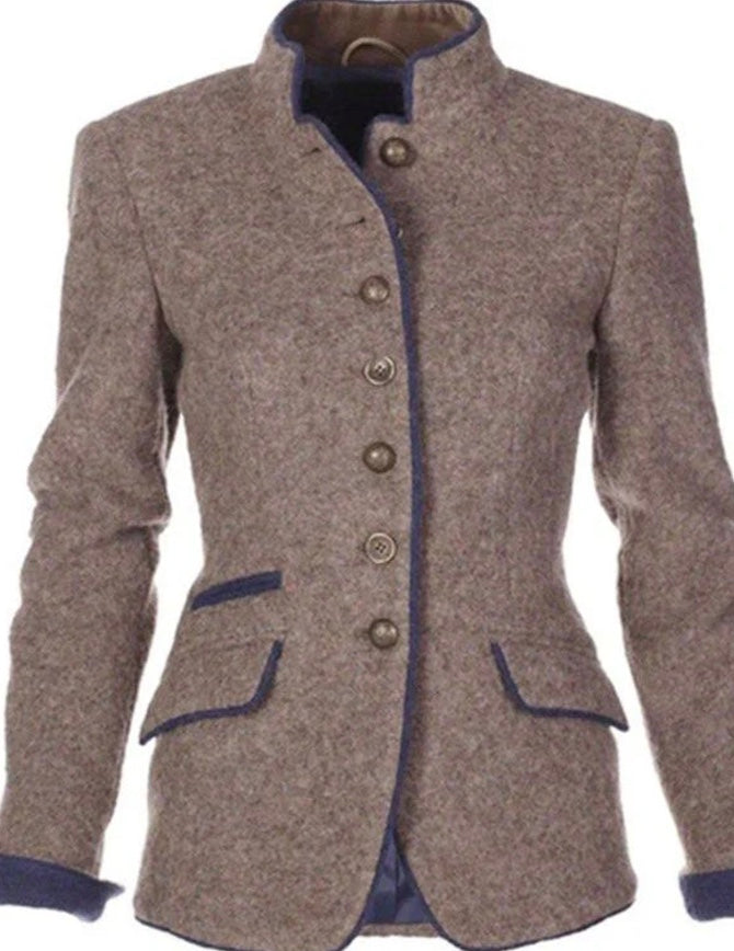 Ta stylowa marynarka tweedowa to połączenie klasycznej elegancji i wyjątkowego stylu w brytyjskim wydaniu. Wykonana z wysokiej jakości, ciepłego materiału o charakterystycznej strukturze, idealnie sprawdzi się w chłodniejsze dni. Fason dopasowany do sylwetki pięknie podkreśla kobiece kształty, a kołnierz typu stójka oraz kontrastowe lamówki nadają całości wyrafinowanego wyglądu. Marynarka zapinana jest na guziki i posiada eleganckie kieszenie z klapkami, co czyni ją zarówno stylową, jak i praktyczną. To doskonały wybór do biura, na spotkania, jak i na co dzień – w połączeniu z jeansami lub spodniami materiałowymi prezentuje się zawsze wyjątkowo.