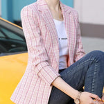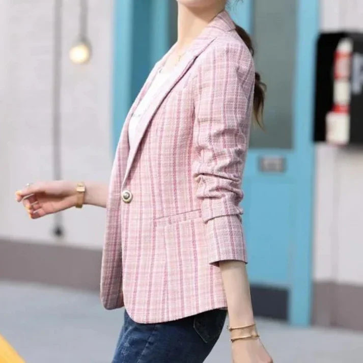 Ta stylowa marynarka w kratkę to idealne połączenie klasyki i kobiecego wdzięku. Wykonana z lekkiego, przyjemnego w dotyku materiału, doskonale dopasowuje się do sylwetki, podkreślając jej kształty i nadając stylizacji elegancki charakter. Subtelny wzór w kratkę w pastelowych odcieniach dodaje świeżości i lekkości, a klasyczny fason z klapami i długimi rękawami sprawia, że marynarka jest niezwykle uniwersalna. Świetnie komponuje się zarówno z jeansami i T-shirtem, jak i z eleganckimi spodniami czy spódnicą. To doskonały wybór na co dzień, do pracy, na spotkania i wiosenne wyjścia.