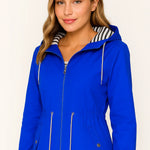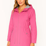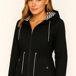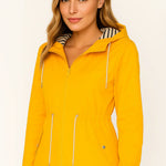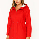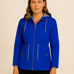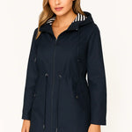 Ta stylowa kurtka damska przeciwdeszczowa to połączenie funkcjonalności i modnego designu. Wykonana z lekkiego, wodoodpornego materiału, skutecznie chroni przed deszczem i wiatrem, zapewniając jednocześnie komfort noszenia. Jej krój typu parka pięknie dopasowuje się do sylwetki dzięki regulowanemu ściągaczowi w talii, podkreślając kobiece kształty. Kaptur z ozdobną podszewką w paski nadaje jej nowoczesnego wyglądu, a praktyczne kieszenie boczne dodają wygody. Zapięcie na suwak i napy gwarantuje dodatkową ochronę przed chłodem i wilgocią. Idealna na spacery, podróże oraz codzienne stylizacje w wiosenne lub jesienne dni.