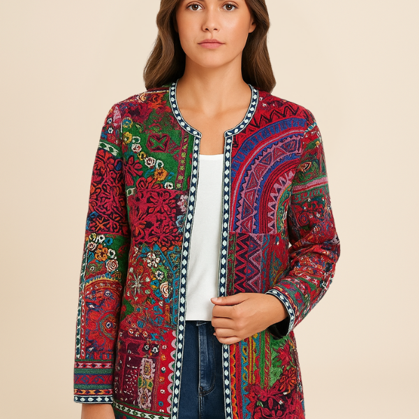 Marynarka damska boho z kolorowym wzorem – stylowy żakiet etniczny