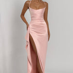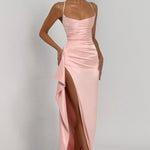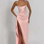 Ta wyjątkowa sukienka satynowa maxi to połączenie elegancji, kobiecości i luksusu w jednym projekcie. Wykonana z delikatnej, błyszczącej satyny, pięknie układa się na sylwetce i subtelnie odbija światło, dodając blasku każdemu krokowi. Drapowanie w okolicach talii doskonale modeluje figurę, podkreślając kobiece kształty, a wysokie rozcięcie na nodze nadaje całości zmysłowego charakteru. Gorsetowy krój z odkrytymi ramionami eksponuje dekolt i szyję, tworząc efekt pełen klasy i wdzięku.