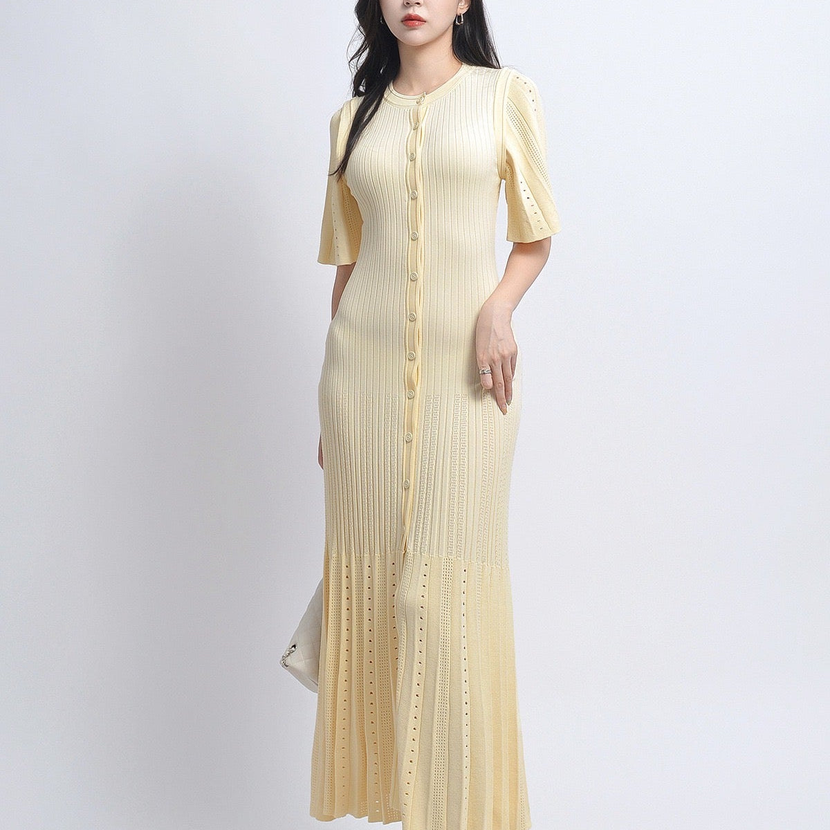 Dzianinowa sukienka midi z krótkim rękawem i plisowanym dołem