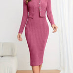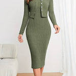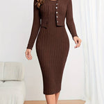 Dzianinowa sukienka midi prążkowana z guzikami i długim rękawem