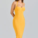 Sukienka bandażowa midi na ramiączkach z dekoltem gorsetowym to wyjątkowa propozycja dla kobiet, które pragną podkreślić swoją figurę i emanować pewnością siebie. Wykonana z elastycznego, dopasowującego się materiału bandażowego, perfekcyjnie modeluje sylwetkę, podkreślając talię i biodra. Gorsetowy dekolt w kształcie serca pięknie eksponuje biust, a długość midi dodaje elegancji i klasy. Cienkie ramiączka oraz przylegający krój sprawiają, że sukienka doskonale sprawdzi się na wyjątkowe okazje – przyjęcia, randki, wieczorne wyjścia czy eleganckie uroczystości. To połączenie seksapilu i luksusu, które gwarantuje zachwycający efekt.
