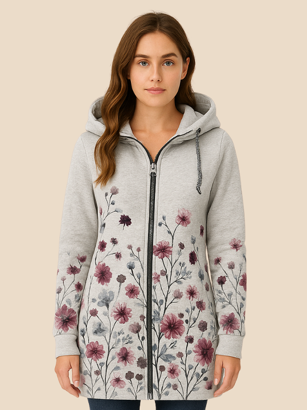 Ta bluza damska z kapturem w kwiatowy wzór to doskonałe połączenie wygody i stylu. Wykonana z miękkiego, przyjemnego w dotyku materiału, zapewnia komfort noszenia przez cały dzień. Jej dłuższy fason świetnie komponuje się z jeansami lub legginsami, a kwiatowe motywy dodają kobiecego uroku. Kaptur i zamek błyskawiczny sprawiają, że bluza jest nie tylko modna, ale i praktyczna – idealna na spacery, wyjścia na miasto czy weekendowy odpoczynek.
