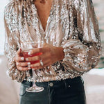 Bluzka damska z cekinami i kopertowym dekoltem to wyjątkowy model, który doda każdej stylizacji blasku i elegancji. Wykonana z lekkiego, przyjemnego materiału, ozdobiona połyskującymi cekinami, pięknie odbija światło i sprawia, że wyróżnisz się przy każdej okazji. Kopertowy dekolt w kształcie litery V subtelnie podkreśla kobiecy dekolt, a lekko luźny krój gwarantuje komfort i swobodę ruchów. Długie, delikatnie prześwitujące rękawy dodają bluzce lekkości i szyku. To idealny wybór na wieczorne wyjścia, imprezy, kolacje czy świąteczne spotkania – łączy w sobie elegancję i nowoczesny glamour.