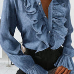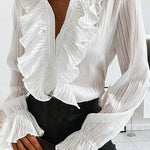 Elegancka bluzka damska z falbanami i dekoltem V to kwintesencja kobiecego stylu, która zachwyca subtelnością i szykiem. Wykonana z lekkiego, delikatnego materiału, pięknie układa się na sylwetce, podkreślając jej atuty. Dekolt w kształcie litery V z ozdobnymi falbanami dodaje bluzce romantycznego charakteru, a rozszerzane rękawy zakończone falbanką wprowadzają nutę elegancji i lekkości. To idealna propozycja do pracy, na spotkania czy wieczorne wyjścia – doskonale komponuje się zarówno z eleganckimi spodniami, jak i ze spódnicą czy jeansami. Dzięki swojemu ponadczasowemu fasonowi i wyjątkowym detalom, ta bluzka stanie się stylowym uzupełnieniem każdej garderoby.