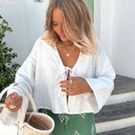 Ta urocza bluza damska z wiązaniem inspirowana stylem boho to idealne połączenie luzu, elegancji i naturalnych materiałów. Wykonana z lekkiej, oddychającej tkaniny o lnianej strukturze, doskonale sprawdzi się w ciepłe dni, zapewniając komfort i świeżość przez cały dzień. Luźny fason z szerokimi rękawami i ozdobnym wiązaniem z przodu nadaje jej wyjątkowego, kobiecego charakteru. To model, który pasuje zarówno do szortów i spódniczek, jak i do lnianych spodni – idealny na spacer po plaży, wakacyjny wyjazd czy letnie spotkanie ze znajomymi. Styl boho podkreślają subtelne detale i naturalne kolory, które wprowadzają lekkość i swobodę.