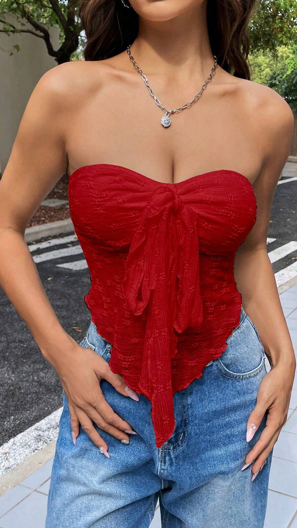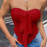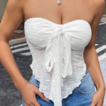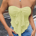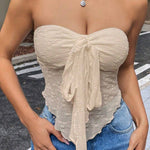 Top damski gorsetowy bez ramiączek to modna i elegancka propozycja dla kobiet, które chcą wyróżnić się w stylizacjach wieczorowych i casualowych. Dzięki dopasowanemu fasonowi pięknie podkreśla sylwetkę, a ozdobne drapowania i wiązanie z przodu nadają mu wyjątkowego charakteru. To element garderoby, który świetnie komponuje się zarówno z jeansami, jak i eleganckimi spodniami czy spódnicą, tworząc kobiecy i stylowy look.